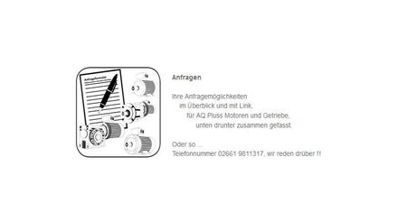 Elektromotor – anfragen Spezialitäten, nicht die einfachen, wie Welle, Flansch oder Achshöhe, sondern „Sonder…“, darüber hinaus. Natürlich machen wir Ihnen E-Motoren mit dickerer Welle, kleinerem Flansch, größerem Flansch, Achshöhe kleiner, Achshöhe größer – es ist meistens (meistens), nicht aber immer – alles machbar. Bedenken sollte man natürlich, dass zu jedem E-Motor an Grundkosten die Kosten für Welle/Flansch bzw. anderes dazu kommen. Kostet zum Beispiel ein 2,2 kW-E-Motor …… Euro, dann kommen für eine andere Welle in etwa 130 Euro plus Mehrwertsteuer dazu. Da wir Ihnen den einen E-Motor so machen, wie Sie den brauchen, brauchen wir auch die Mehrkosten dafür – für unsere Leistungen. Kommen wir zurück zum Thema „Elektromotor anfragen Spezialitäten“. Wie am besten? So, dass wir genau wissen, was Sie benötigen. Für solche Dinge haben wir Vorlagen als Texte zum Ankreuzen und Skizzen, in den jeweiligen Bauformen (Bauart), um in diese Ihre benötigten Bauformen einzutragen. Unter Abfrage halten wir die Vorlagen als Download bereit. Die AQ Pluss Motoren-Infoseite für Elektromotoren, Getriebe und Dienstleistungen hält da einiges bereit. Die bemaßten Blätter (Bilder) der Normmotoren, Vergleichslisten von Welle, Flansch und Füßen. Je genauer Ihre Angaben sind, umso schneller können wir eine Problemlösung anbieten und die Kosten benennen. Natürlich, wie wir am meisten bekommen, genügt eine Nachricht über die Kontaktaufnahme vom Elektromotoren-Blog zum Beispiel, wie hier unten. Wir melden uns dann zurück, um die Details konkreter zu umreißen. Jetzt den Kontakt für Ihre Anfrage E-Motor …. Nutzen!